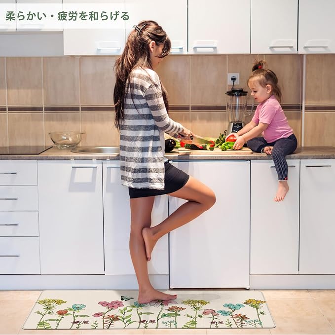 厚みのあるPVC素材で快適な踏み心地:0.8cmの厚みでクッション性抜群!立ち仕事の多いキッチンでも足腰の負担を軽減。もちもちの柔らかさで、素足でもスリッパ履きでも快適に使えます。