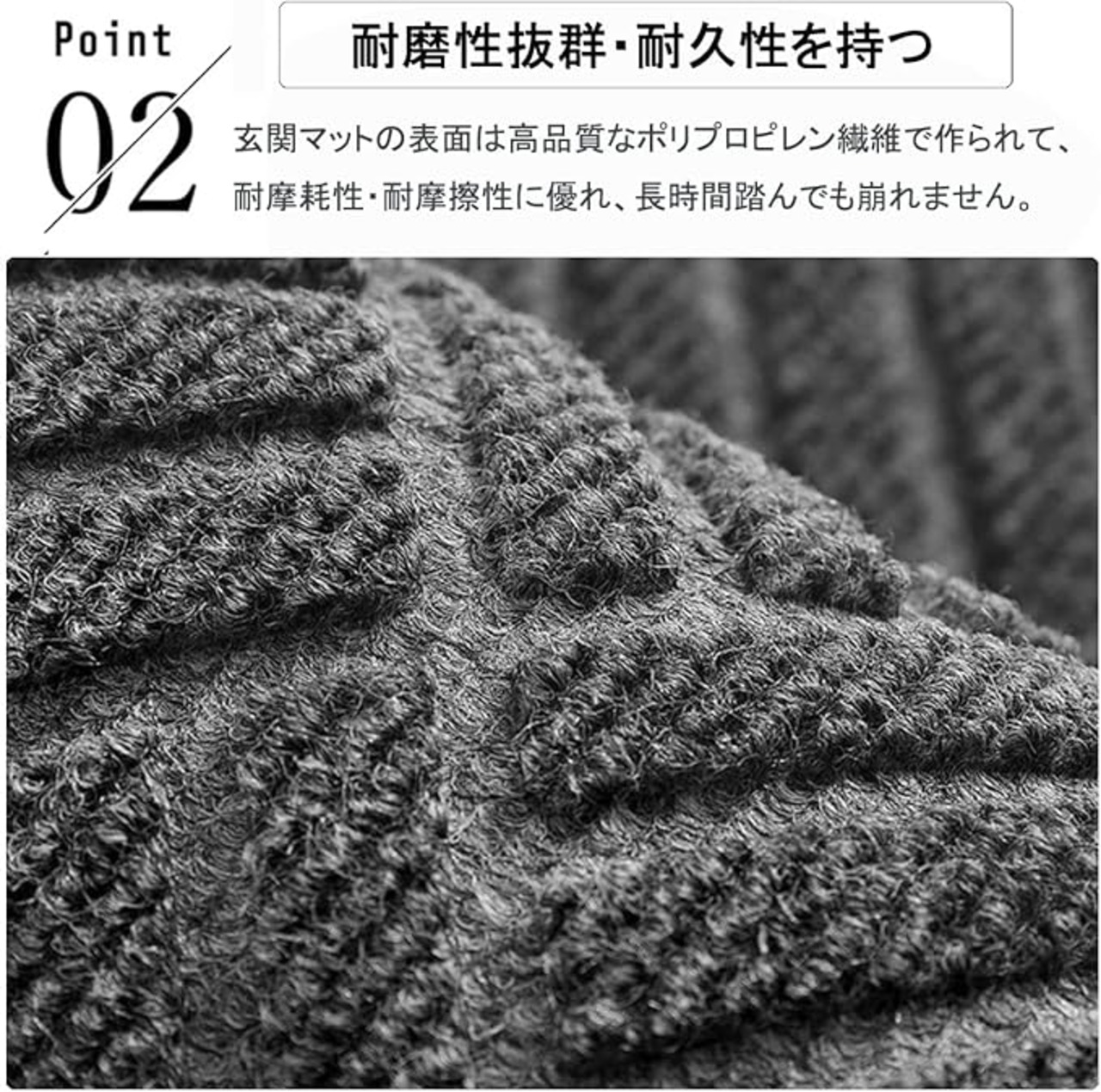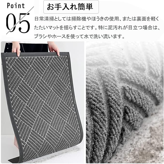 【商品仕様】カラー:グレー、サイズ:約60x90cm、重量:約1.6kg、表面素材:ポリプロピレン繊維(耐磨耗性&耐久性抜群);裏面素材:天然ゴム(滑り止め機能付き);屋外・屋内どちらでも使える玄関マットです。