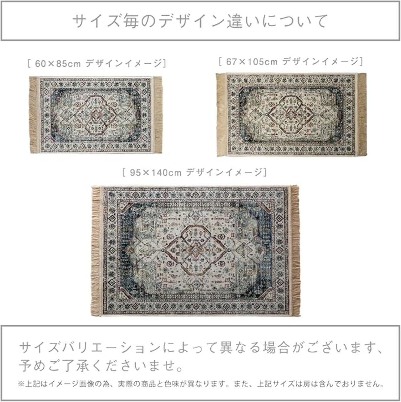 【輸入カーペットを安心してご利用いただくためのお願い】 ●輸入ラグに関して ※同じ商品でも製造ロットの違いによって、サイズや、色味、柄模様の左右が反転していたり、位置がズレている場合がございます。ただし、現地の工場や倉庫での検品をクリアした商品を輸入しています。あらかじめご了承くださいませ。/ ●においに関して ※ご使用当初、裏面に塗られる仕上げの接着塗料(ラテックス剤)のにおいがする場合がございます。人体への影響はありませんが、においに敏感の方や、ご心配の方はご理解の上ご購入お願いいたします。開封後常温のもとで気化(蒸発)するため、においはご使用につれてなくなります。気になる場合は風通しの良いところで陰干ししていただきますと、より早く解消されます。/ ●サイズに関して ※カーペットの製法上、表示サイズより0~3%の誤差がございます。/ ※いずれも商品の初期不良ではございませんので返品・交換は行なっておりません。(※お客様で返品の送料ご負担によるキャンセルは、返品規定に基づきお受けさせていただきます。)/ ※裏面の製品シールは剥がさないでご使用ください。