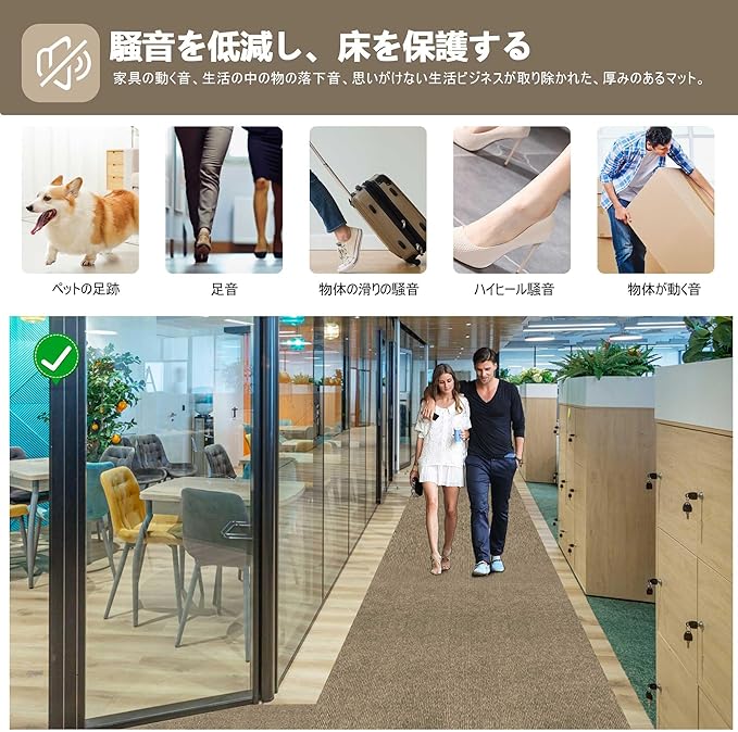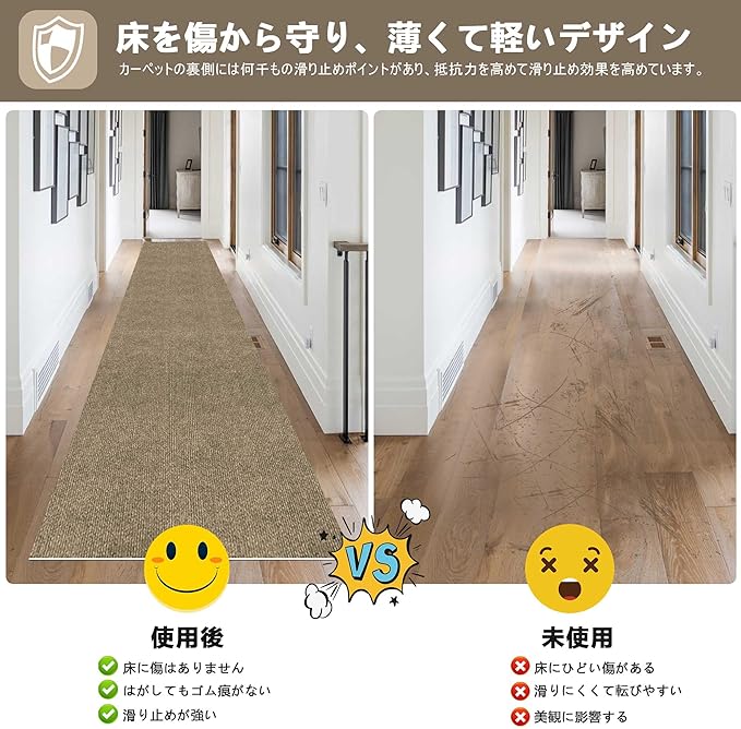 【騒音防止+傷防止】廊下マットはPUとポリエステル不織布材料を用いて作られ、吸音性に優れ、様々な場所に適している。子供が走って遊ぶ音、ペットの爪が床に当たる音、椅子の摩擦音、ゲームをする音など、小さな生活音を吸収し、騒音を低減することができます。廊下のマットの底の自己吸引材は廊下にしっかりと貼り付けられており、冬には足を保護し、冷たい床を遮断することもできます。