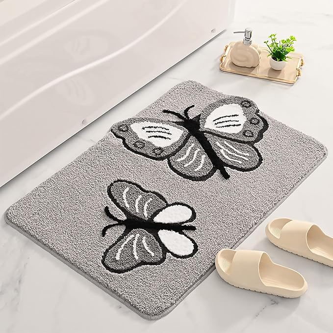 玄関マット 屋内 バスマット 可愛い蝶々柄 おしゃれ 吸水 速乾 洗える滑り止め 浴室マット お風呂マット北欧 ふわふわ 家庭用 業務用 屋外 抗菌 防臭 大判 大きい 厚手 足拭き 泥落とし 丸洗いOK プレゼント (グレー, 40 60cm) | KAZESHOP