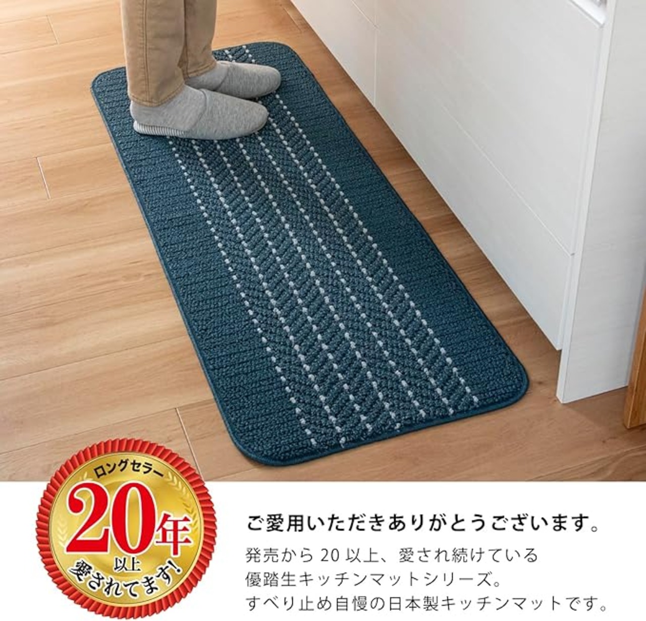 優踏生キッチンマットはたくさんのお客様から”ずれないキッチンマット”としてたくさんのお喜びの声を頂く20年以上のロングセラー。掃除機やロボット掃除機でもずれないので快適な使い心地です。丁寧に作られた日本製の良質で上品なキッチンマット。