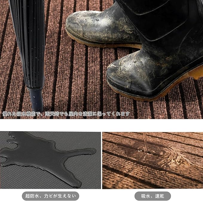 【泥落とし、吸水】屋内、屋外でお使いいただける泥落としマットです。長い梅雨の日でも大雪の日の中でもフロア汚れを最小限に抑えます!また、マットが抗菌性・防臭性、一年中も快適にご使用いただけます