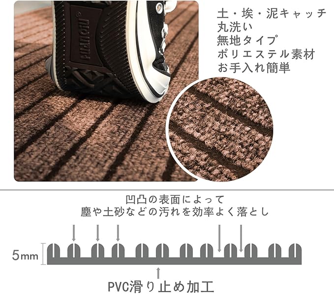 【非常に経済的で耐久性に優れている】店頭などの業務用に最適です。1ヵ月のレンタル料金相当で買えてとても経済的なウェルカムマットです。会社やマンションの入り口はもちろん、泥除去や吸水性能にも優れており、マットの背面にも滑り止め加工が施されているので、キッチンや入浴場などの場所の滑り止めマット、キッチンマットとしてもご使用いただけます。無地で自由にカットできるデザインなので、さまざまな使用場所に適用され、汚れがついても目立たないのが特徴です。