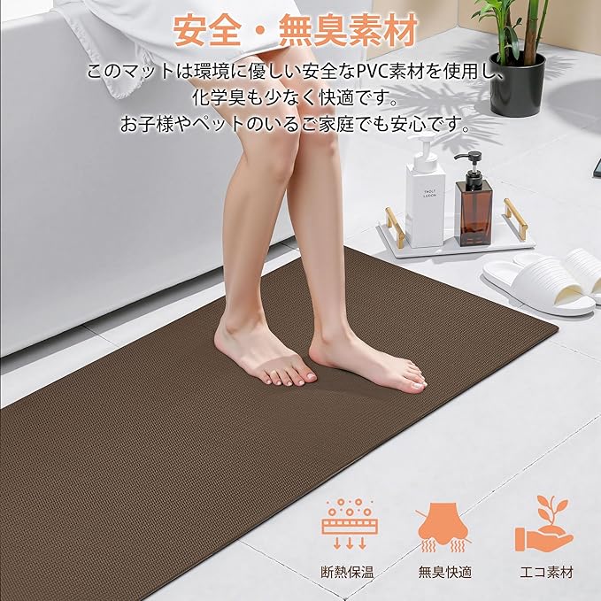 湿気の多い浴室やキッチンでも安心の防滑機能!特殊加工されたPVC素材で、滑りにくく安全にご使用いただけます。
