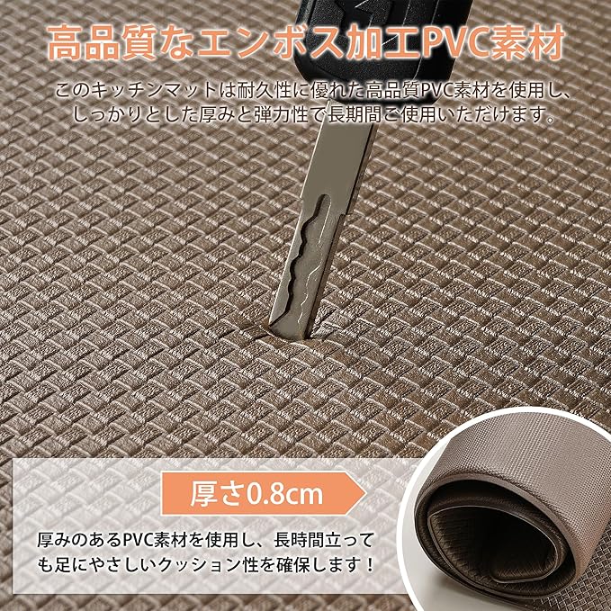 【柔らかい触り心地】VECELOのキッチンマットは足に優しい柔らかいPVC素材で、裸足で踏んでも快適です。足裏をしっかりと支えることで、リラックス効果も期待できます。環境に配慮したPVC素材を採用し、有害物質を含まず、安全でエコフレンドリーな設計です。