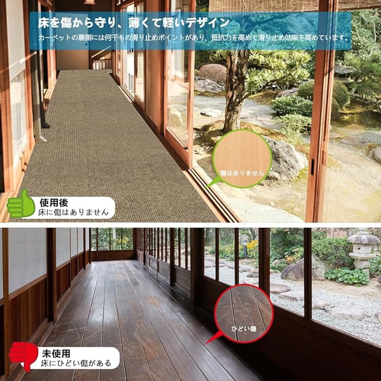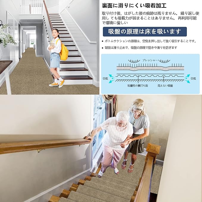 【繰り返し使用可能】廊下マット裏面には自己吸引原理が採用されており、圧縮空気が床に吸着することで、はがしても床に跡が残らない。マットは定期的に持ち上げて掃除する必要がある。掃除機を直接使って掃除することができ、長期使用後は、手洗いや洗濯機で洗濯することができます。再設置後も吸着力が弱くならず、繰り返し使用でき、環境に優しく、お金も節約できます。