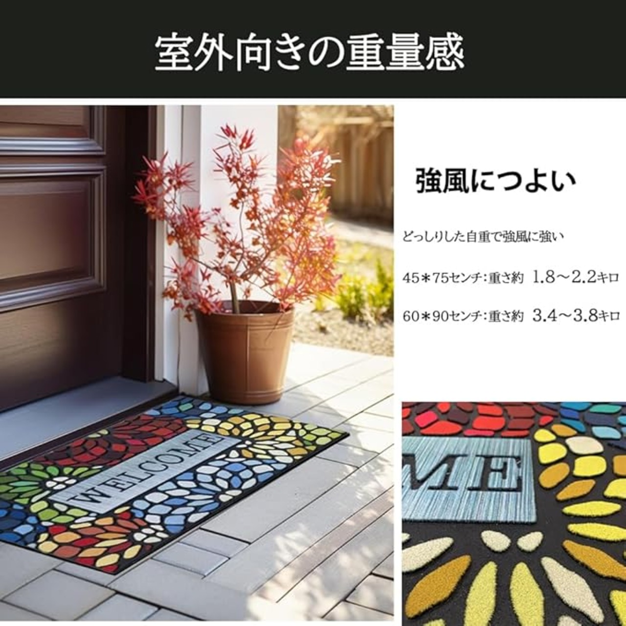 1.商品仕様: 60㎝*90㎝ 厚さ 1㎝ 約3.4キロ 2.サイズの確認について:ご使用前に使用対象となるエリアを測ってください。新聞紙でのシミュレーションをおすすめします。3.ご注意:強い紫外線により、使用期間が長くになるについて色褪せすることがありますので、ご了承ください。