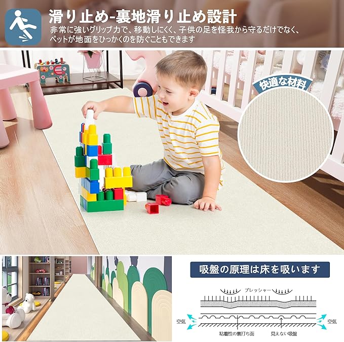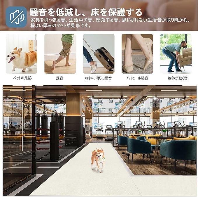 【床保護&防音】廊下保護マットは高密度素材で床のキズ・擦り傷・汚れを防止するとともに、足音や物音を最大60%低減。特殊クッション層が床への衝撃を吸収し、滑り止め加工で安全性も確保した多機能マットです。廊下はもちろん階段やリビングなど、様々な場所でお使いいただけます