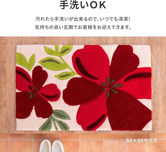 最長約16mmのパイル長と打ち込みもよく、足あたりがソフトで踏み心地もふかふかです。柄の周りはカービング加工を施し、動きのある表情に仕上げています。手洗いできるので汚れても安心。裏面は、滑り止め付きだからズレにくく安心です。玄関だけではなく、ベットサイドなどのアクセントマットとしてもおすすめです。