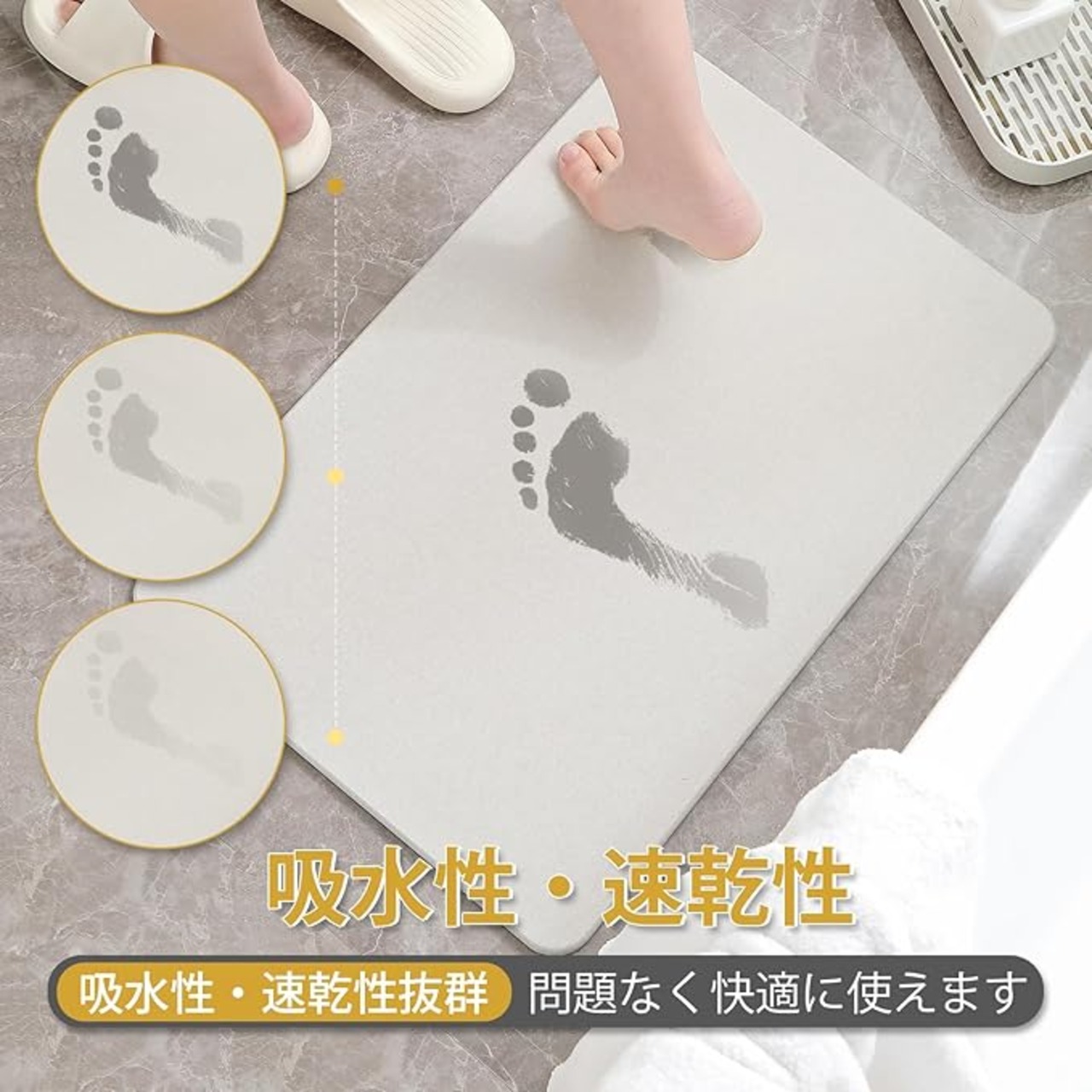 【驚きの吸水性 ・ 速乾性】お風呂上がりのびちゃびちゃ足を置いた瞬間にぐんぐん吸水、あっという間に乾燥します。お子様がいるご家庭や、大家族でも快適に使用可能。