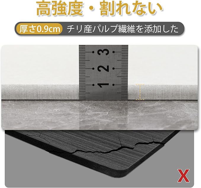 【厚さ9mm ・ 割れ、歪みに強い】マットの厚さはわずか9mm。圧倒的な吸水、速乾性能を誇るので、内部に水分を溜め込むための分厚さは必要ありません。マットは2.2kgと軽量ですが、しっかりとした強度を実現しました。