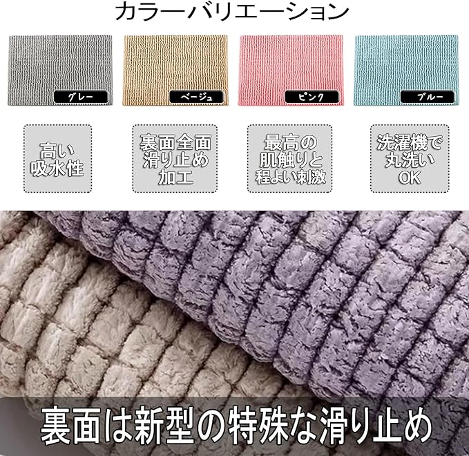 最新型のバスマットがあなたのバスルームを快適な空間に。驚きの滑り止め効果と吸水力、速乾性をご堪能下さい。シンプルなデザインと実用性と兼ね備えたこの足ふきマットは、お風呂上がりの水滴をしっかりキャッチ。さらっとした使い心地で、いつでも快適な足元を保ちます。一粒一粒がしっかりとしているので、足裏に刺激も与えてくれます。
