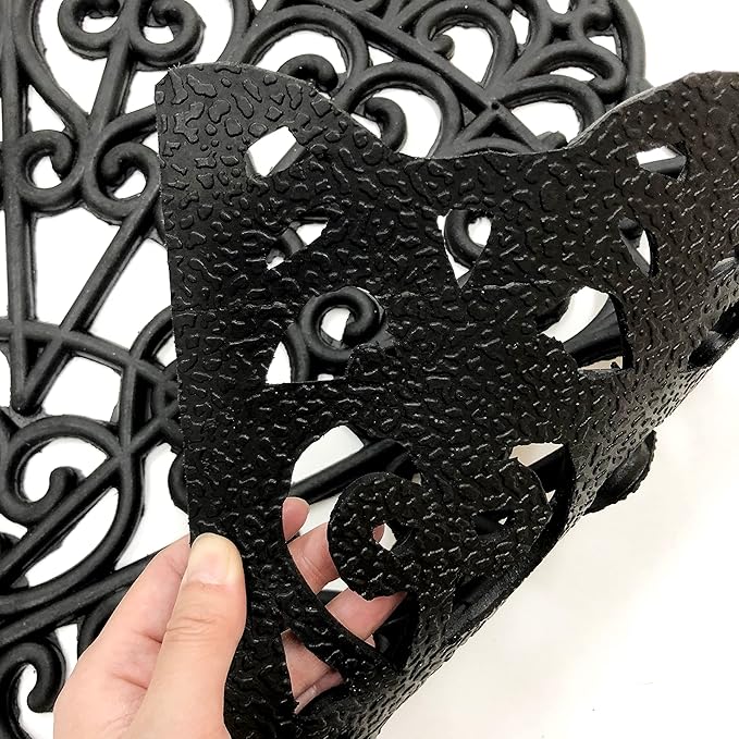 まるでアイアン(鉄)でできているかような高級感と重量感のあるマットです。曲線が美しいアラベスク模様はすべて職人が一つ一つ手作業で切り出しており、手間暇をかけた逸品となっています。
