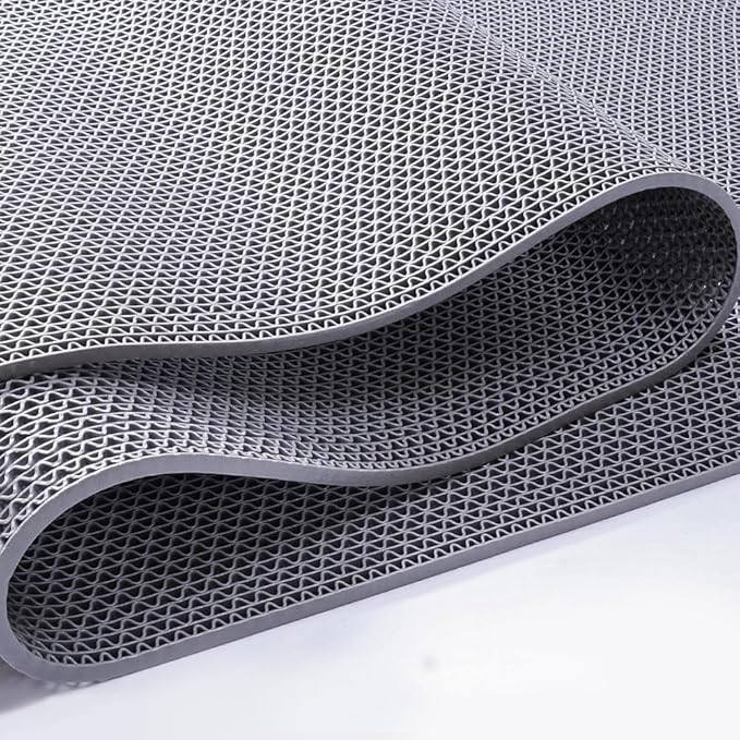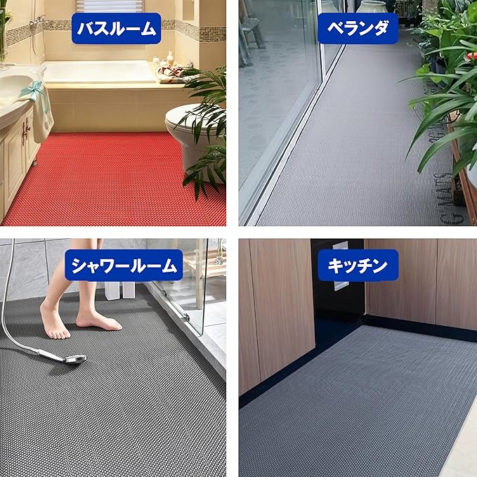【転倒・滑り防止】:このマットは、湿気や滑りやすい場所での転倒を防ぐために設計されています。マット全体がS字型のハニカム構造を持ち、浴室やプールサイドなどでも優れた滑り止めテクスチャーにより安定したグリップを提供し、滑りのリスクを回避します。防滑係数テストをクリアしており、木製デッキ、濡れた木の床、玄関、出入口周辺、傾斜のある滑りやすい場所、タイル、コンクリート、石材の床、金属板、格子状の床など、様々な地面で効果的に滑り止め効果を発揮します