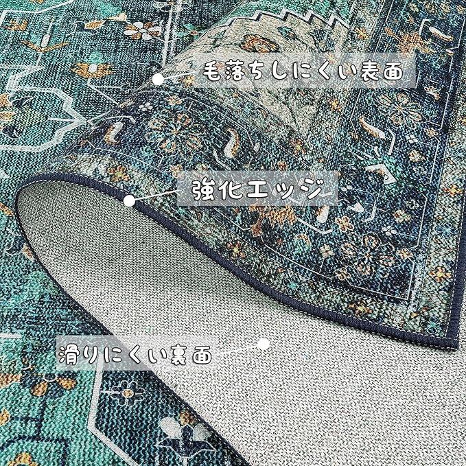【ペルシャ風デザイン】高精度プリント技術で繊細な模様を再現。伝統的なペルシャ模様をモダンにアレンジした上品なデザインのカーペットで、シンプルな空間のアクセントに最適です。縁は巻き縫い処理でほつれを防止、角まで丁寧に仕上げた軽やかな見た目が特徴です。