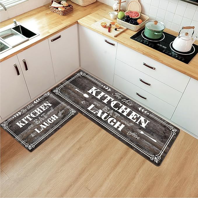 デザインと注意事項:このマットには「KITCHEN EAT LAUCH」などの英文が付いて、優しい色合いでどんなキッチンにも合わせやすいですが、素材特有のにおいがあるため, 気になる場合は水拭き後、風通しの良い場所で陰干ししてください。鋭い物に弱いので、取り扱いには注意が必要です。