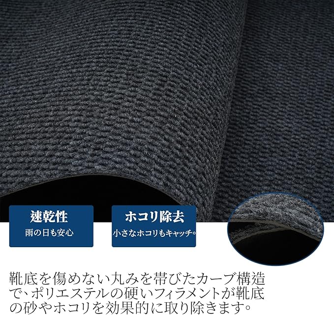 優れた防塵性能と高い吸水性:マットの表面の凹凸が滑り止めになるだけでなく、細かい泥や砂、ホコリを遮断し、室内への侵入を防ぎます。