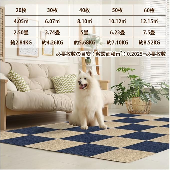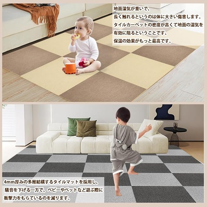 【防音保温・4mmの厚み】4mmの丁度いい厚さ、熱伝導性に優れ、夏場はしっかり通気、冬場は床暖房の熱がしっかり届きます、オールシーズン対応。タイルカーペッ ト表層の織物の生地は柔らかく、手触り感が良い、また防音効果もあり、騒音を生じることが効 果的に防げます。防音効果もあって、ペットやお子様が走り回る足音や掃除機をかける音などの生活音も階下に伝わりにくくなります。