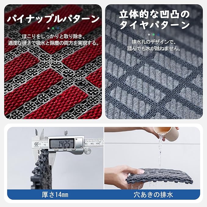 泥落とし機能: 玄関外マットとして、靴の汚れや泥をしっかりキャッチし、玄関を清潔に保ちます。掃除が楽になるので、日常の手間を軽減します。