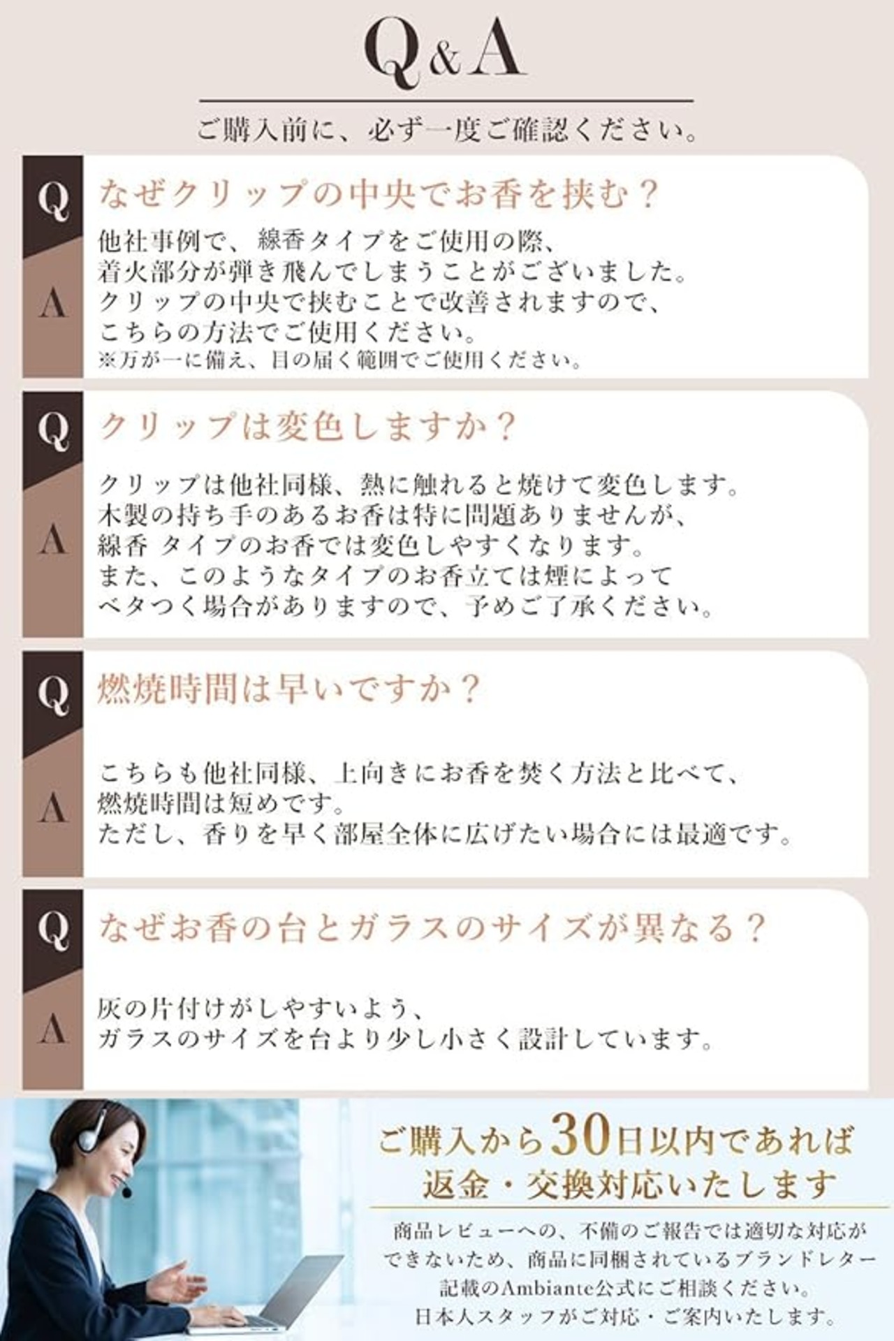 【多様なお香に対応】 クリップ型の構造により、さまざまなタイプのお香に対応可能。 ※線香タイプのご使用時は、熱によりクリップが変色する場合があります。また、お香を下向きに焚くタイプでは、クリップ部分にベタつきが生じることがあります。
