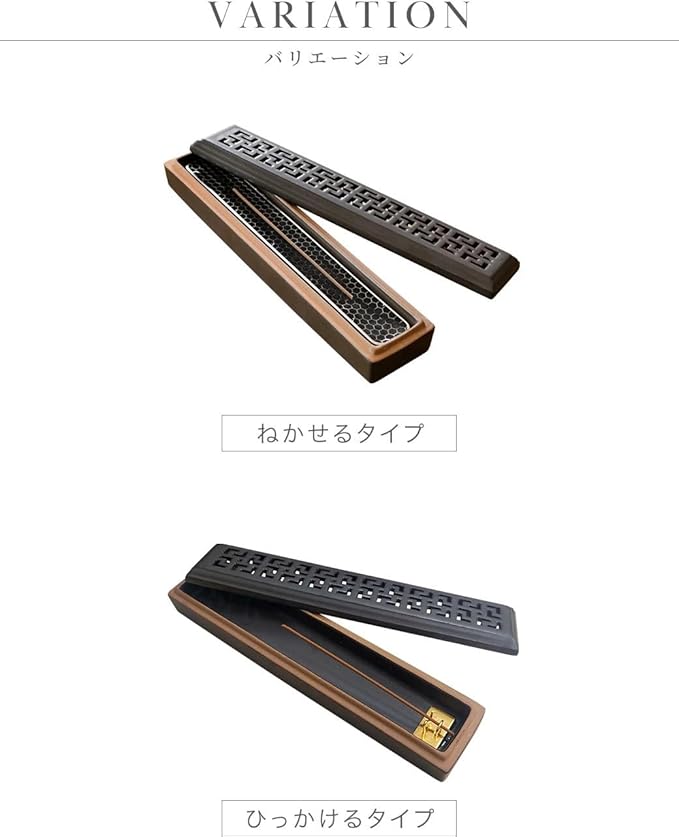 【2通りの使い方】 セラミックに直接線香を置く方法と、金属製レバーで線香を支える方法の2種類で使用可能。線香を水平に近い角度にセットすることで、蓋に当たらず綺麗に燃焼します。金属レバーはペンチで簡単に高さ調整ができるので、お好みの線香の長さや太さに合わせてご利用いただけます。