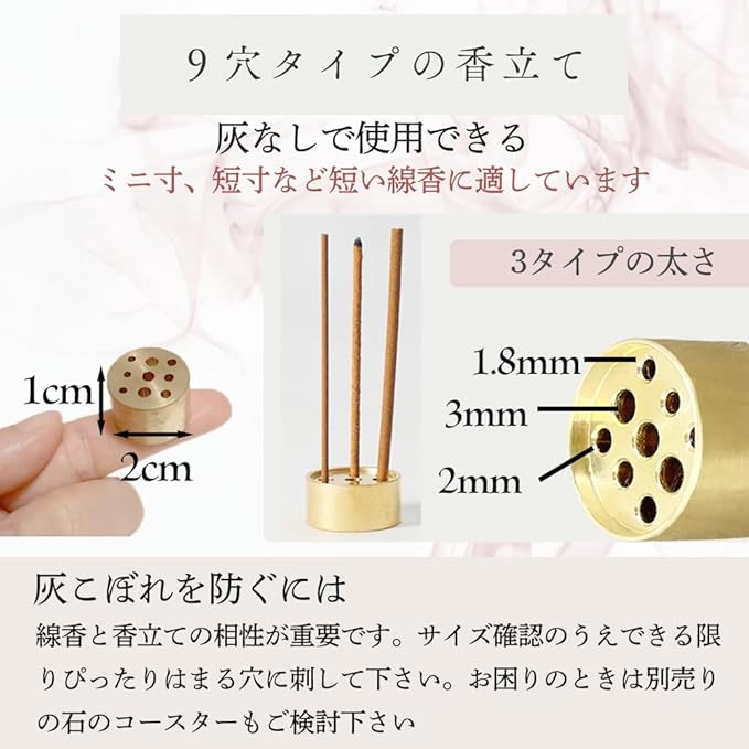 【セット内容・仕様】香炉+香立て(お香は含まれておりません)、材質:香炉/陶器製、香立て/真鍮製 ■香炉のサイズ(約):①ハスの花 8*3.2cm ②ほか 直径6.5cm 高4.2cm ■香立てのサイズ(約):高さ1cm、幅2cm 香立ての穴の直径は、約1.8mm、2.0mm、3.0mm ※直径3.0mm以下のお香にお使いいただけます。小型上置き仏壇に収まるミニ香炉です。