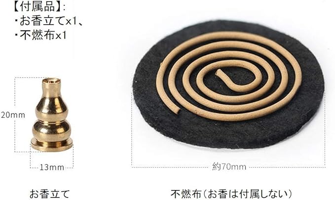 サイズ(約):胴径8.5cm、口径 7cm、高さ5.1cm。重量:約200g。セット:香炉x1、蓋x 1、お香立てx1、不燃布x1.