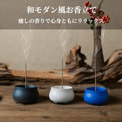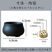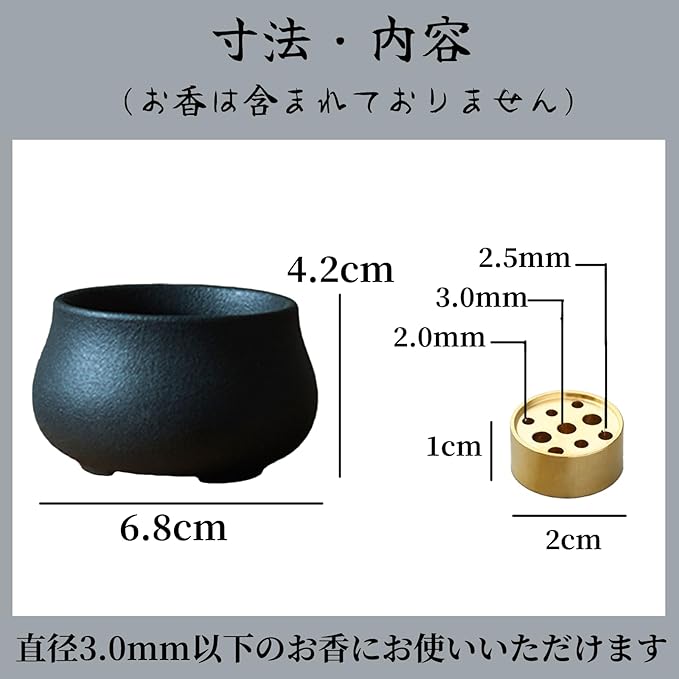 【セット内容・寸法】香炉+香立て(お香は含まれておりません)、灰掃除用ブラシ 1本 材質:香炉/陶器製、香立て/真鍮製 香炉のサイズ(約):高さ4.2cm、口径5cm、幅員6.8cm 香立てのサイズ(約):高さ1cm、幅2cm 香立ての穴の直径は、約2.0mm、2.5mm、3.0mm ※直径3.0mm以下のお香にお使いいただけます。