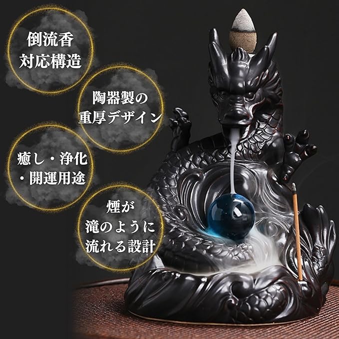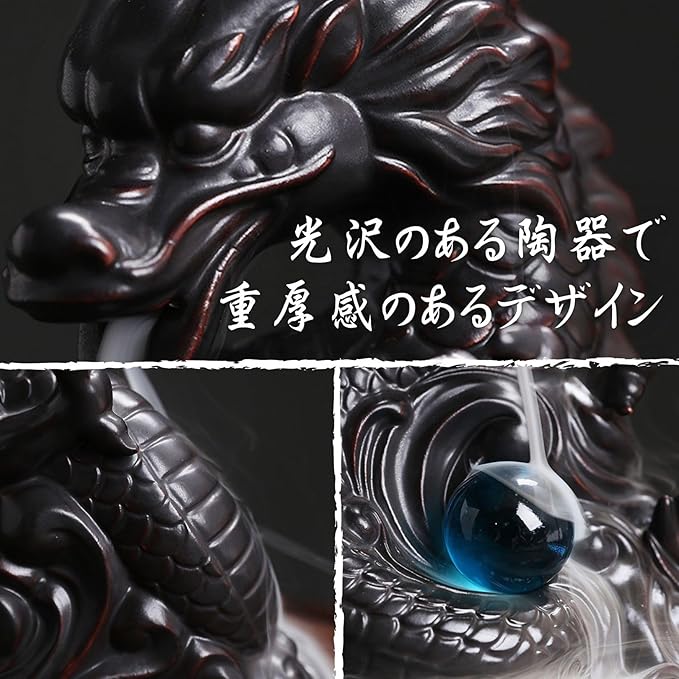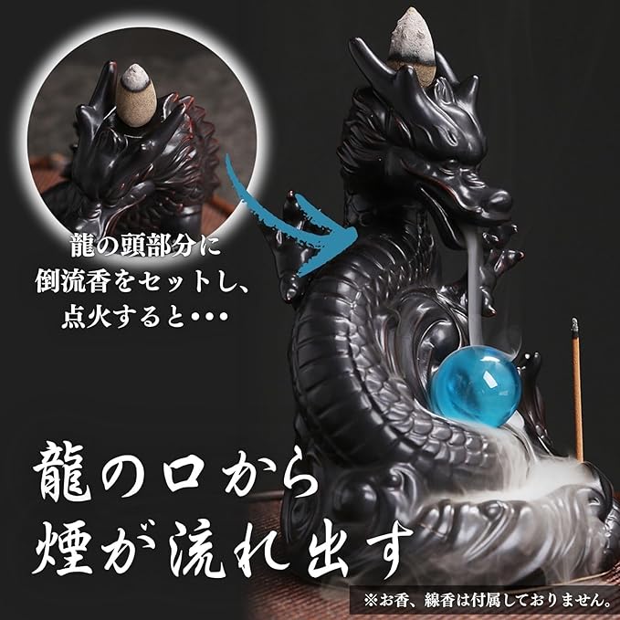 龍の迫力ある造形とミステリアスな雰囲気が融合した逆流香炉。香を焚くと、煙が滝のように下へ流れ落ち、幻想的な景色を演出します。お香が燃えるたび、龍が息を吹きかけているような神秘的な空間に包まれます。