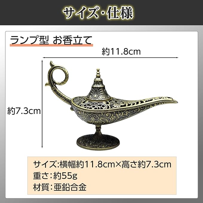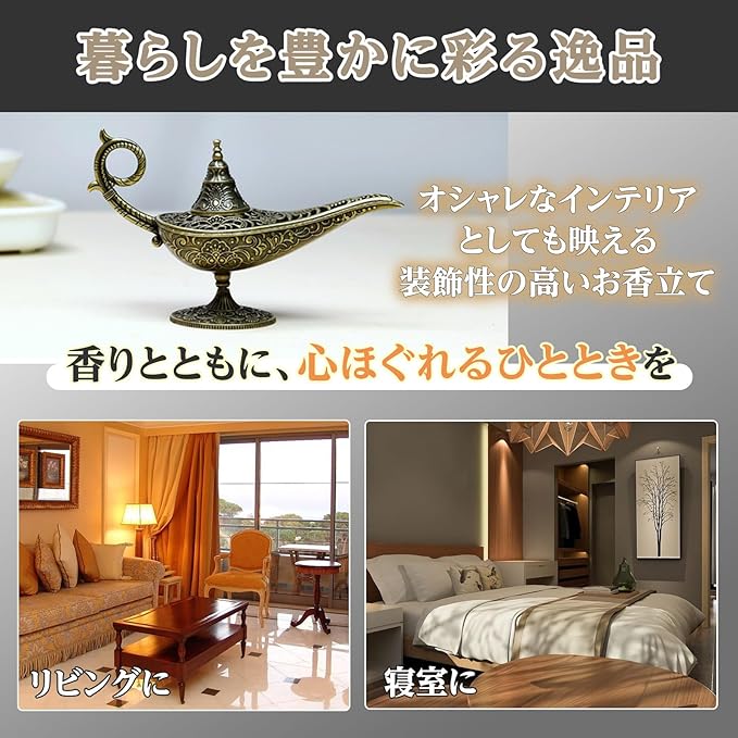 ランプ型のお香立ては、香りと共に癒しのひとときを演出します。デザイン性にも優れており、エキゾチックなデザインが和洋問わずさまざまな空間に馴染みます。手のひらサイズで置く場所を選ばないのもポイントです。
