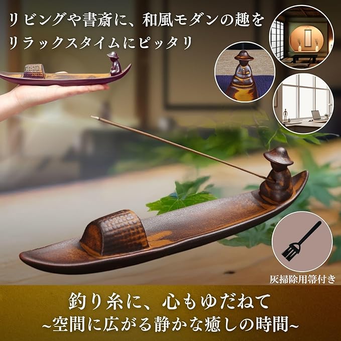 【和モダンな癒し空間を演出】おしゃれな陶器製お香立て 和風のデザインと現代的なセンスが融合した陶器製お香立てです。釣り人をモチーフにしたユニークな形状で、線香を斜めに差し込むと、まるで釣りをしているかのような姿を楽しめます。リビングや書斎、茶室など、さまざまな空間に調和し、癒しの時間を提供します。