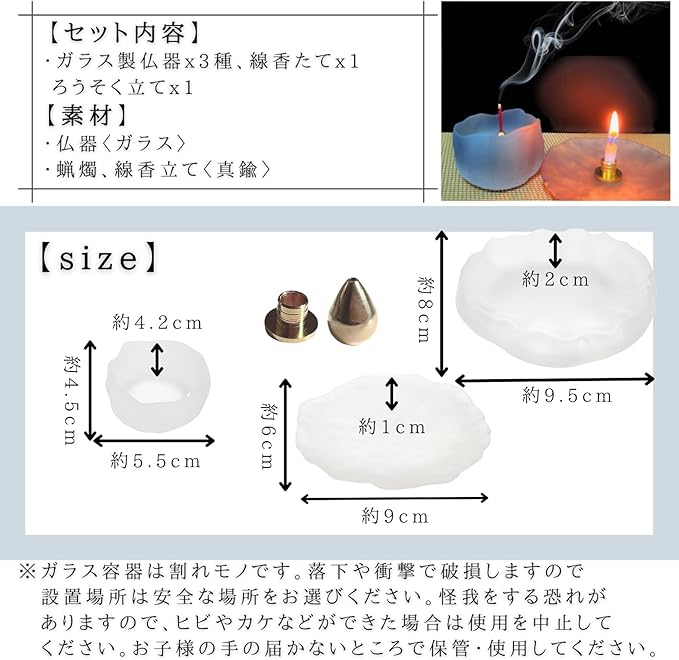 【セット内容】ガラス製仏器x3種、真鍮製 線香たてx1、真鍮製 ろうそく立てx1 合計5点セット 【サイズ】小 幅 約5.5cm 高さ 約4.2cm、中 約6cmx9cm 高さ 約1cm、大 約8cmx9.5cm 高さ 約2cm