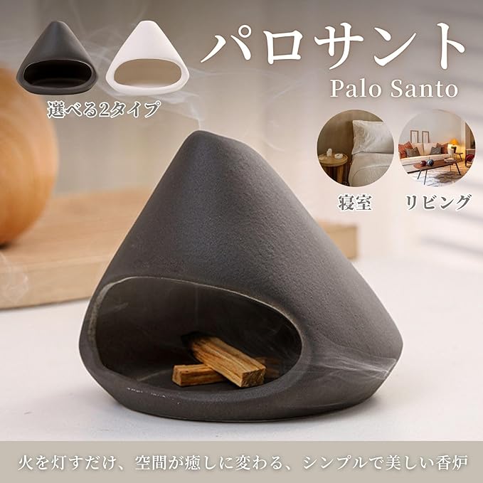 ちまき型のユニークなフォルムが目を引くパロサントホルダー。丸みのある本体にはスティックを簡単に入れられる広口設計、上部には煙が立ち上がる通気孔付きで、幻想的な雰囲気を演出します。