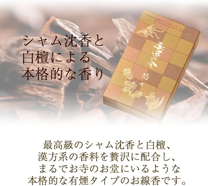 最高級のシャム沈香と白檀、漢方系の香料を贅沢に配合した、はせがわオリジナルのお線香です。合成香料を含まない、香木そのものの香りに、気持ちがやすらぎます。