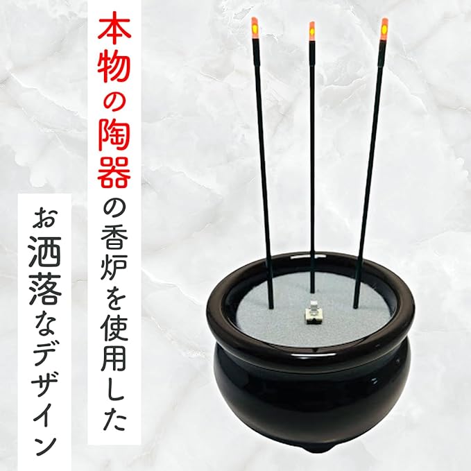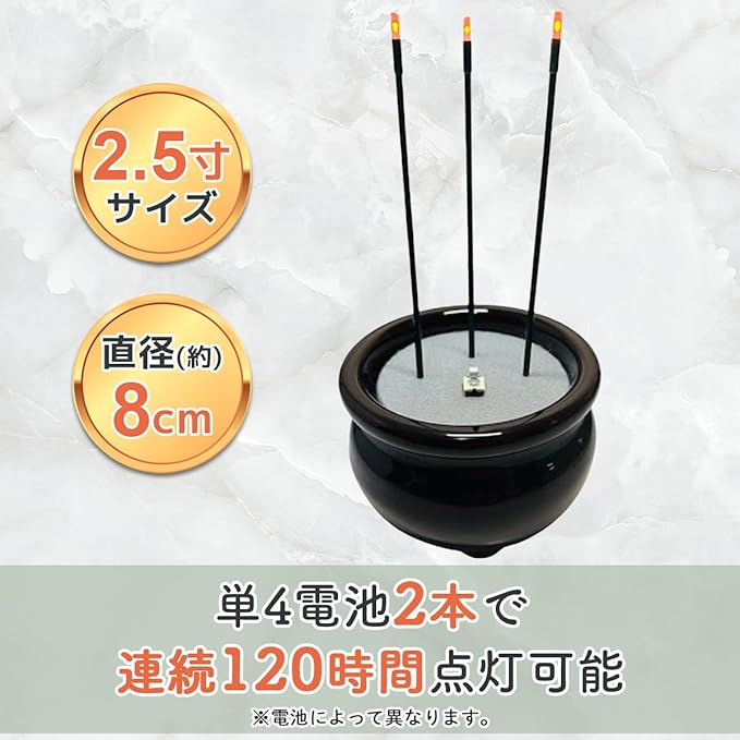 【火を使わず安心・安全! 煙なしの電子線香 】 お仏壇に欠かせない線香を、もっと 安全・便利 に。 「仏具・サンやすらぎ 電子線香」は、火を使わず、煙やニオイも出ない 電池式LED線香です。 ☑火事の心配なし – お年寄りやお子様がいるご家庭でも安心! ☑ 煙・ニオイなし – アレルギーや換気の手間が不要! ☑ 長寿命・省エネ – 交換の手間が少なく、経済的! 【商品の仕様】 ●サイズ: 香炉(2.5寸): H57 W78 D78mm 香炉(3寸): H67 W94 D94mm ●素材:陶器(香炉) ●包装:専用パッケージ ●宗派:どの宗派でもお使いいただけます セット内容:サンやすらぎ本体1個・香炉1個・本体スペーサ1個・線香部3本・目隠しシール2枚・単四乾電池(テスト用)2本 電池寿命:連続約240時間(単四アルカリ電池の場合)
