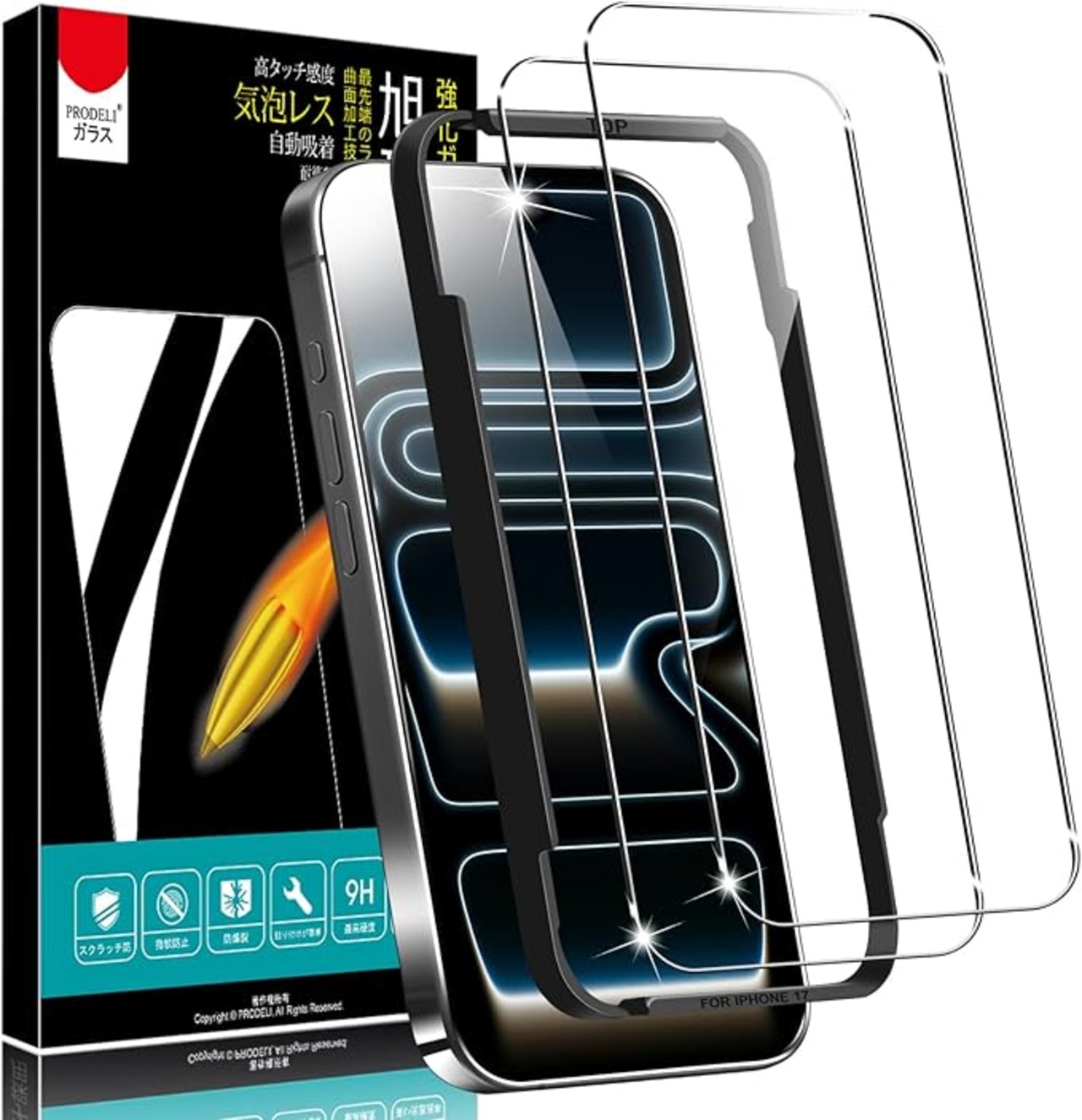 PRODELI For iPhone 17 Pro 専用 ガラスフィルム ガイド枠付き 硬度9H 耐衝撃 2.5Dラウンドエッジ 自動吸着 飛散防止 強化ガラス クラッチ防止 高透過率 指紋防止 アイフォン 17 プロ 用 保護フィルム 【2枚セット】 | KAZESHOP