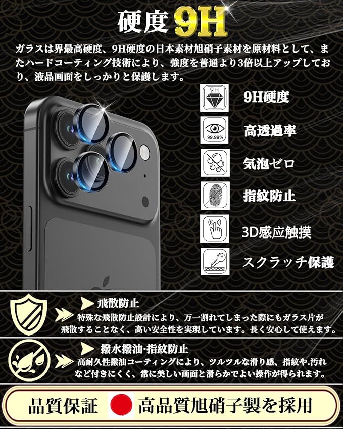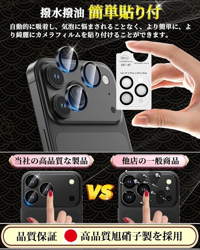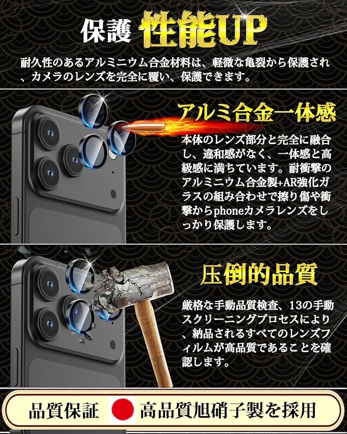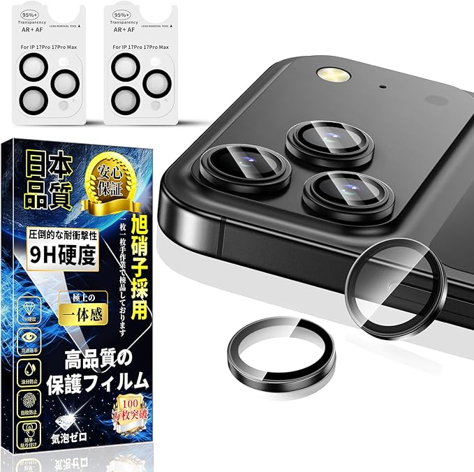 【アルミ合金製・徹底防御!対応機種】iPhone 17 Pro / 17 Pro Max 専用 カメラフィルム 露出オーバー防止。衝撃に強いアルミ合金製+日本製9H強化ガラスの組み合わせ全面保護タイプで最高な保護力を提供しています。擦り傷や衝撃からカメラレンズをしっかりと守られます。