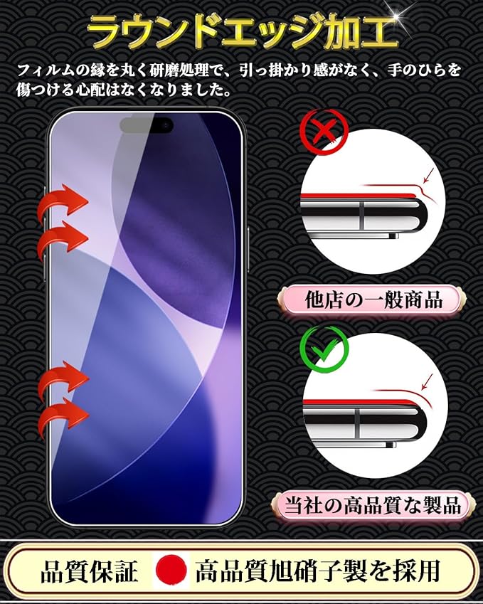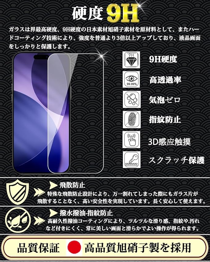 【日本旭硝子素材採用!圧倒的な耐衝撃性】徹底的にこだわった品質、信頼できる日本製旭硝子素材を採用、通常ガラスフィルム などと比べ、強度、耐傷性、質感のすべてにおいて優れた性質を持ちます。安心してご使用いただけるように、一枚一枚、手作業で検品しておりました。また、ガラスフィルム卓越した耐衝撃性能を持って、落下への衝撃からしっかりと保護。万が一強力な衝撃でガラスフィルムが割れてしまっても、破片の飛び散りを防ぐ飛散防止コート処理で、画面をしっかり保護、スマートフォン をよく保護できます。