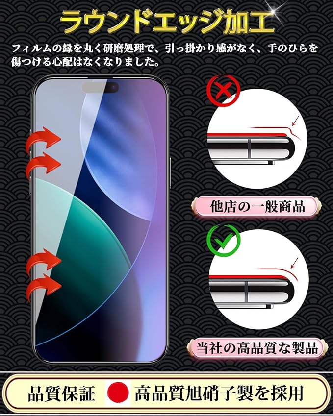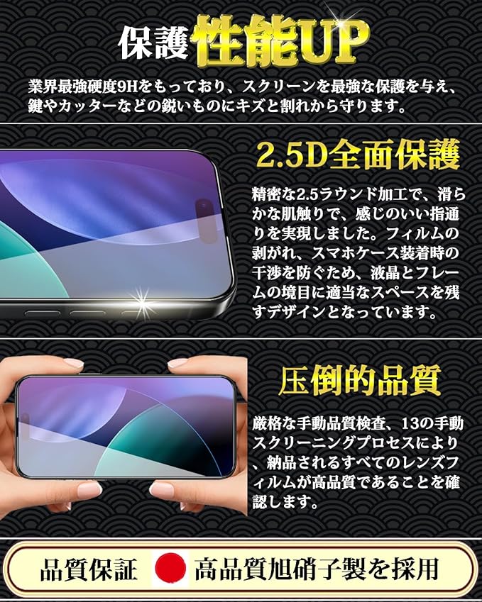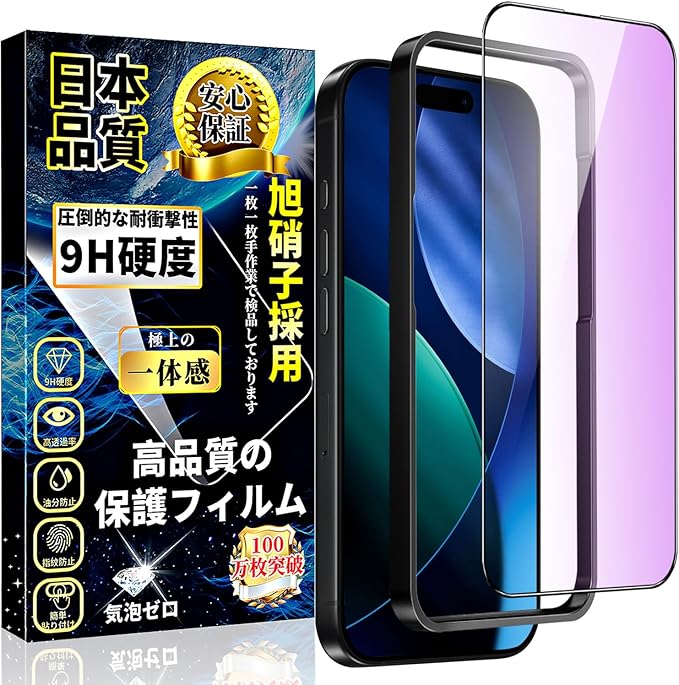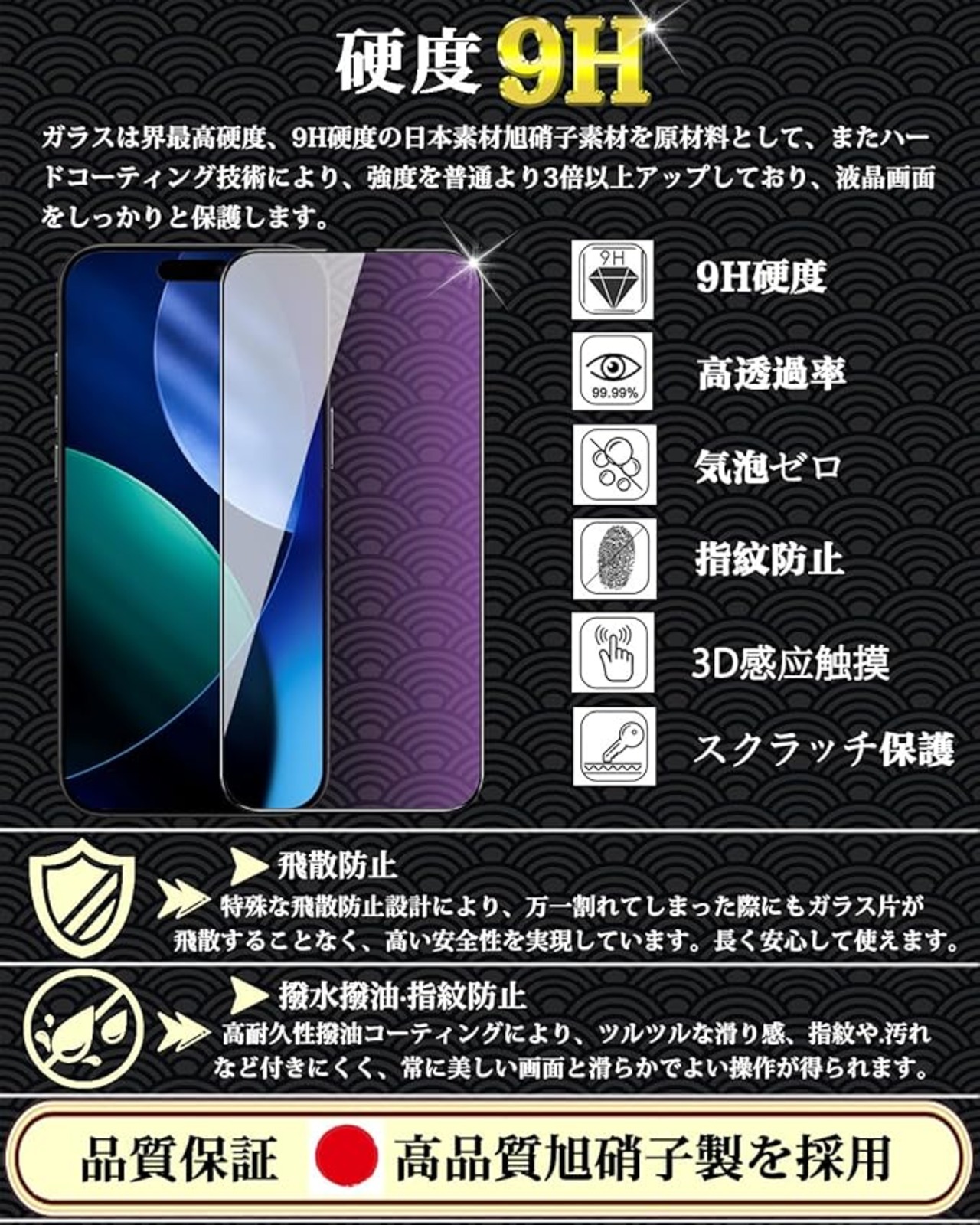 特徴 ブルーライトカット,9H表面硬度,飛散防止,防指紋,撥油コーティング,撥水剤,耐衝撃性,ラウンドエッジ,気泡なし,高透過率,簡単貼り付け