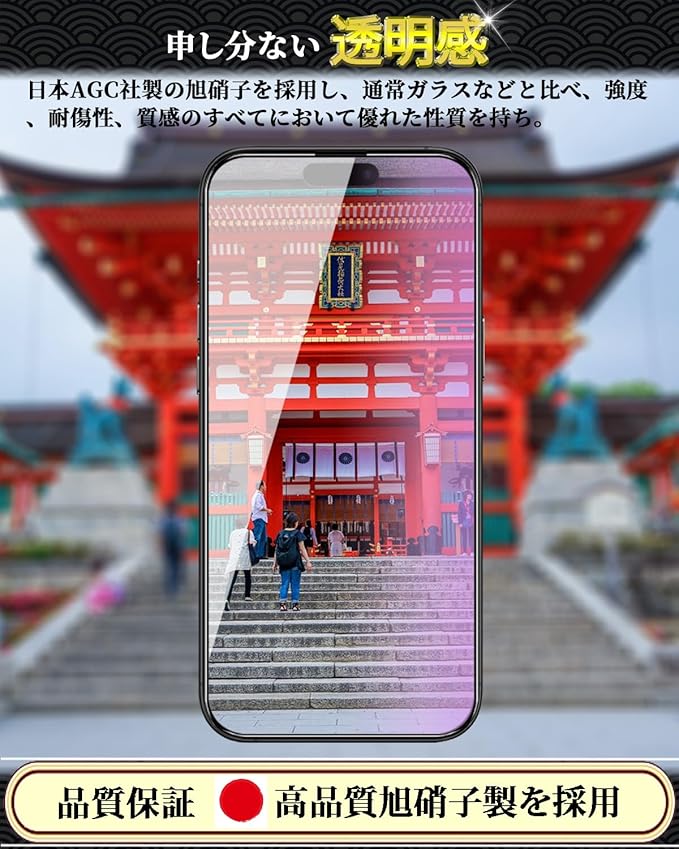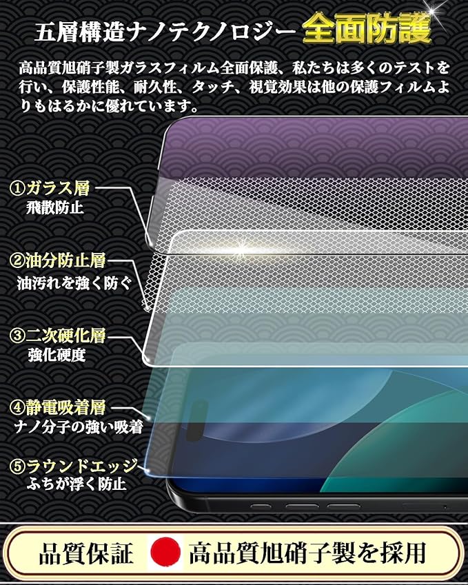 【表面硬度9H!飛散防止】日本製素材旭硝子製を採用しております、高品質な素材で衝撃を緩和し画面の破損を最低限まで抑えます。9H硬度で、ハードコーティング技術により、衝撃を緩和し画面の破損を最低限まで抑え、すり傷や指紋からもスクリーンをしっかりと保護します。