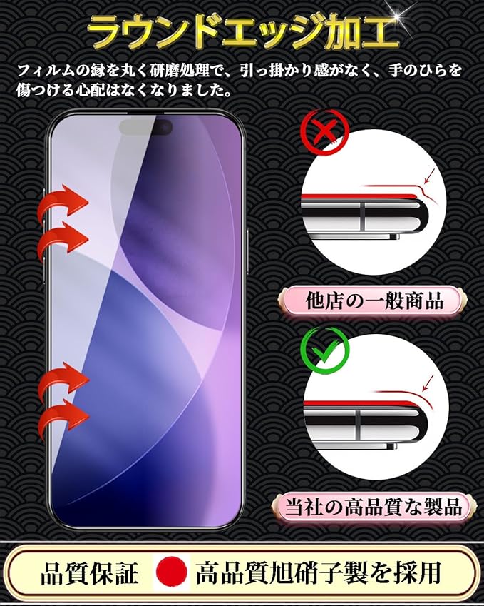 特徴 ブルーライトカット,9H表面硬度,飛散防止,防指紋,撥油コーティング,撥水剤,耐衝撃性,ラウンドエッジ,気泡なし,高透過率,簡単貼り付け
