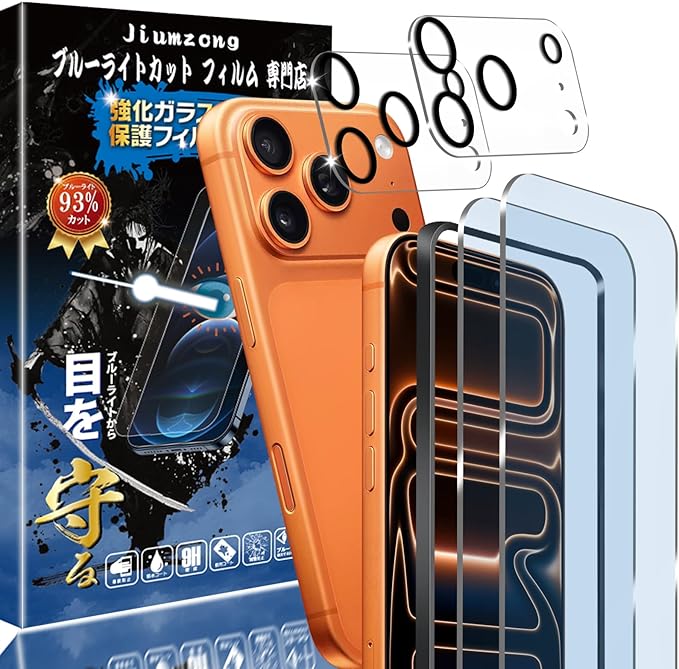 【ブルーライトカット 93%】iPhone 17 Pro ガラスフィルム(2枚入り)フィルム+(2枚入り)カメラフィルム アイフォン17 Pro フィルム 目の疲れ軽減 IP 17 Pro 用の ガラスフィルム 液晶保護 保護ガラス レンズ保護フィルム | KAZESHOP
