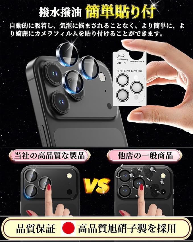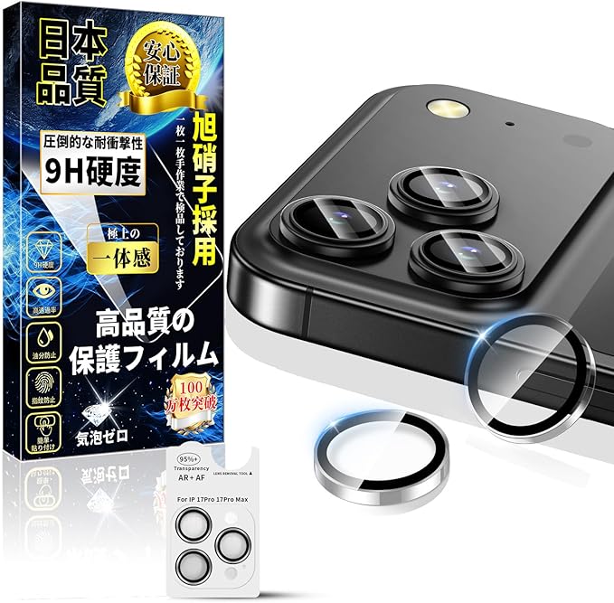 【対応機種】iPhone 17 Pro / 17 Pro Max 用 カメラフィルム 露出オーバー防止。精密加工により、透明なアクリルリングとガラスで、レンズに溶け込むような一体感。カメラ保護フィルムは、貼り付けてもカメラレンズより0.26mmほどしか高くならないため、カメラレンズそのままで使っているような自然なデザインです。