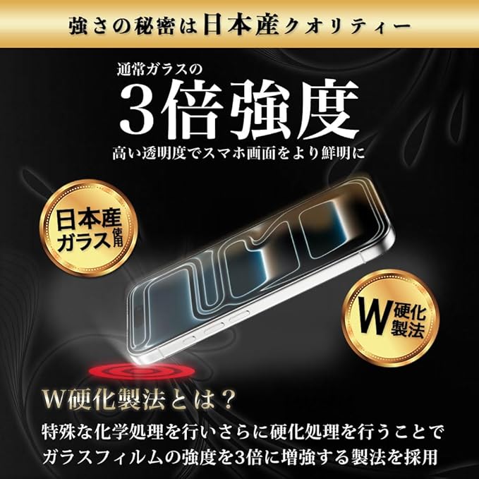 【日本製ガラス使用】 高品質な国産ガラスを使用し、W硬化製法により一般的な強化ガラスの3倍の強度を実現。
