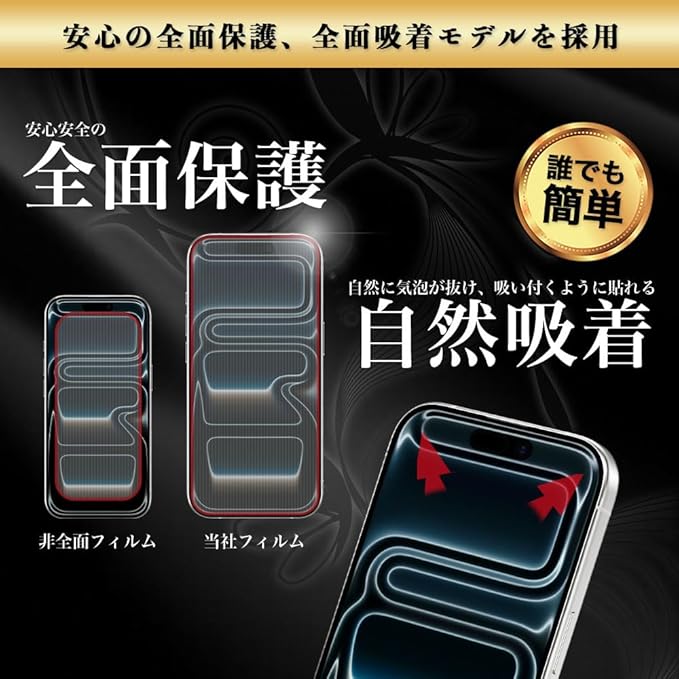 【気泡ゼロ貼付】 自動吸着タイプで貼り付け簡単。フィルムが自然に吸着し、貼り直しも可能。