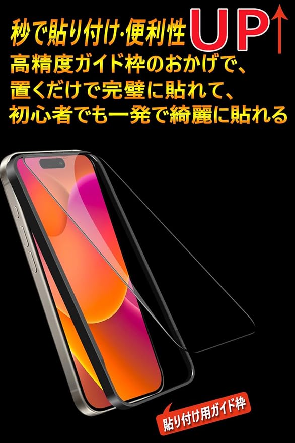 【置くだけで装着!ガイド枠付き・保護ケースと干渉なし】専用の貼り付けガイド枠が同梱されています。ガイド枠を利用することで、初心者でも簡単に貼り付けます。また、自己吸着できるシリコン粘着シートで、簡単的に貼り付けます。ガラスを液晶に置くだけで自然に吸着、簡単に気泡が抜いて行くので、誰でも簡単、綺麗に貼ることができます。より一体感のある仕上がりを実現しました。本体の縁にスペースを残すデザインを取っており、ほどよいサイズ感で、液晶画面を覆いながら、スマホケースと干渉せず併用できます。