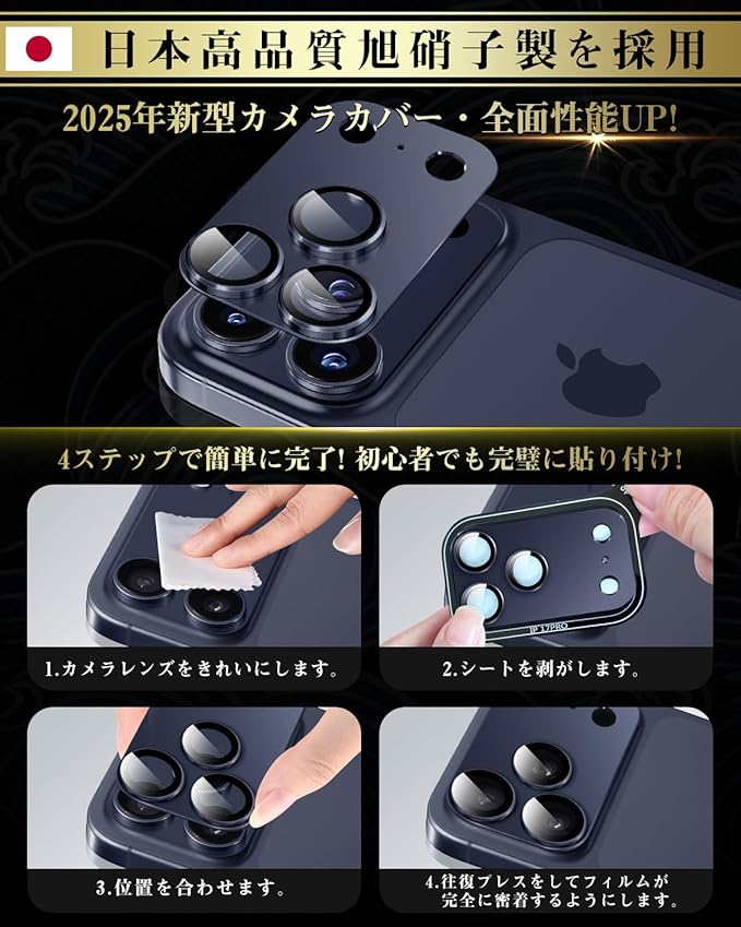 3⃣【全面保護!防塵効果】ガラスカメラフィルムは大切な17 Proを全面保護するため、3眼のレンズ部分だけではなく、四角い台座部分も全方位カバーで、剥がれにくくて全面保護できます。広い面を覆うため、カバーの密着度合いが非常に高くて、レンズのみのカバーと比較して防塵効果も高くて、ホコリが入りにくい構造です。