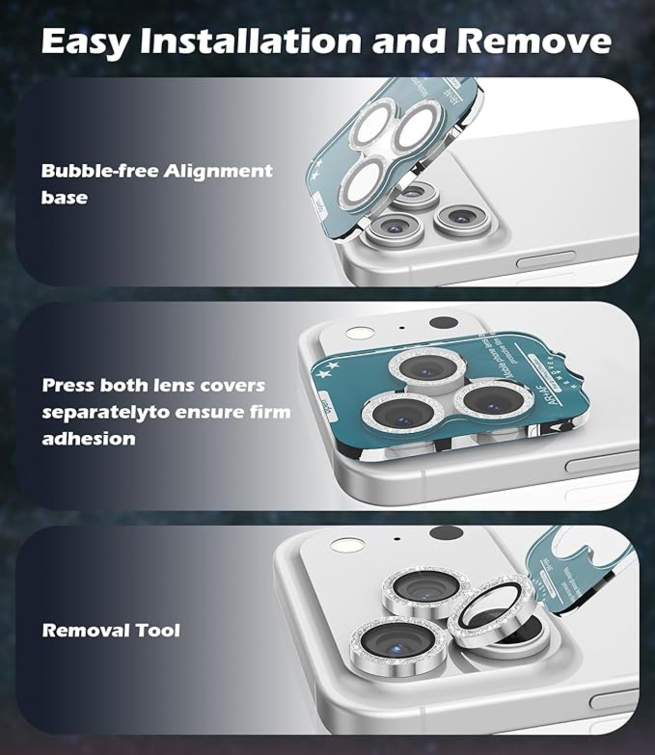 imluckies グリッター カメラフィルム iPhone 17 Pro/17 Pro Max用 AR+AF強化ガラス&9H硬度飛散防止加工 HDクリアメタルレンズカバー(取り付けトレイ付き)いphone 17 pro/17プロ max用2025 ブリンシルバー | KAZESHOP