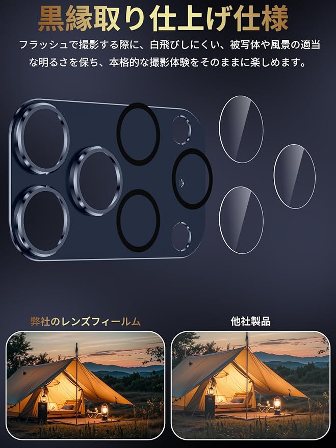 【一体化デザイン・360 全面保護】弊社のレンズ保護フィルムは、最高硬度9Hの強化ガラスとアルミ合金を採用し、一体型構造により従来品と比べて保護性能が大幅に向上しています。鍵やカッターなどの鋭利なものが当たっても傷つきにくく、日常使いでも安心です。さらに、万が一ガラスが割れても破片が飛び散らない飛散防止仕様で、安全性も抜群。